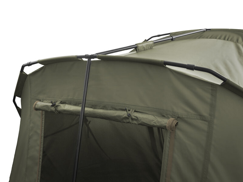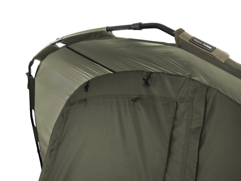 Con dimensioni ideali per un lettino, il bivvy offre anche spazio sufficiente per l’attrezzatura del pescatore. È perfetto per gli spot più piccoli dove non ci sta un bivvy grande. Grazie alle dimensioni di trasporto compatte, può essere trasportato facilmente anche in zone lontane dove l’auto non arriva. Il frontalino (visiera) è integrato direttamente nel primo arco della struttura. Su di esso si trovano due FIXROD, ideali per appoggiare le canne.