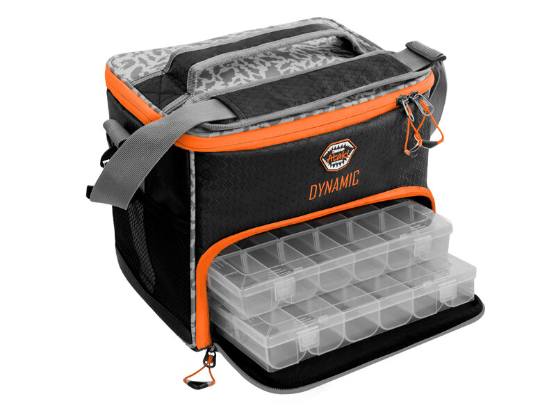 La parte inferiore contiene due scatole di plastica per le esche. Le scatole sono separate da un divisorio rimovibile e i compartimenti interni sono regolabili, quindi puoi organizzare lo spazio in base alle tue esigenze. Sui lati della borsa si trovano tasche in rete per oggetti dimenticati o aggiunte dell’ultimo minuto.