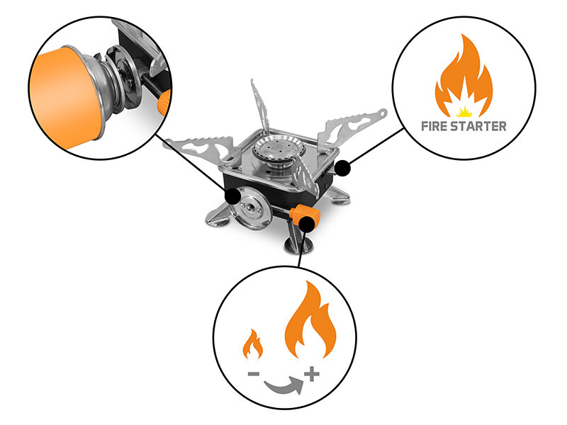 Il fornello è compatibile con cartucce di butano da 220g (400ml) con valvola a sgancio rapido, prodotte in conformità con la norma EN417. Basta premere la valvola della cartuccia contro il meccanismo di fissaggio sul fornello nella posizione corretta, ruotarla leggermente e l'assemblaggio è pronto per l'uso. È dotato di una regolazione rotativa del flusso di gas e di accensione piezoelettrica, grazie alla quale non avrete bisogno di fiammiferi o accendini.