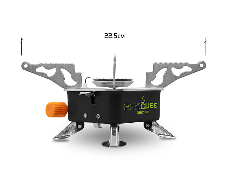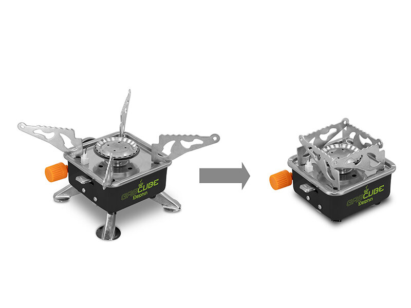 GASCUBE è dotato di gambe pieghevoli, quindi può essere facilmente e stabilmente posizionato sul terreno. Le braccia del fornello possono essere utilizzate in due posizioni - chiuse o aperte, a seconda del diametro della pentola o padella utilizzata. Il corpo è progettato in colore nero con grafica verde effetto.